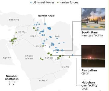 - Israel struck Iran’s South Pars gas field, triggering retaliation threats by Iran targeting key Gulf energy infrastructure.